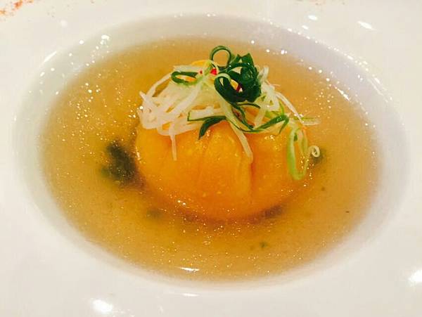 前菜算是東北角以及宜蘭名產的集錦,包含海味-海藻和蝦丸以及烤鴨,其實都不算是太名貴的食材,都真的不得不佩服主廚高超的料理手法。海藻搭配的酸甜醬料,再配上一點點的辣味,讓本身沒味道的海藻味道活潑了起來; 鴨肉本身較乾澀的口感,則用了些蔬菜搭配讓入口更為爽脆; 蝦丸部份則也利用蔬菜中和海鮮可能的"海味"。