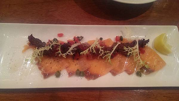 重點不在煙燻鮭魚,而是在搭配的醬料,口味雖然偏酸,但反倒意外的爽口,尤其在炎熱的夏天,是一道很適合的開胃菜。另外,我個人倒是有一個很另類的吃法,就是吃的時候,再搭配一杯可可拿鐵,很意外的是,當醬料酸的口味留在口中時,再喝一口可可拿鐵,反而會帶出可可更香甜的口感,拿鐵的順口度也會更好,大家有機會可以試試看這種反差的搭配方式。