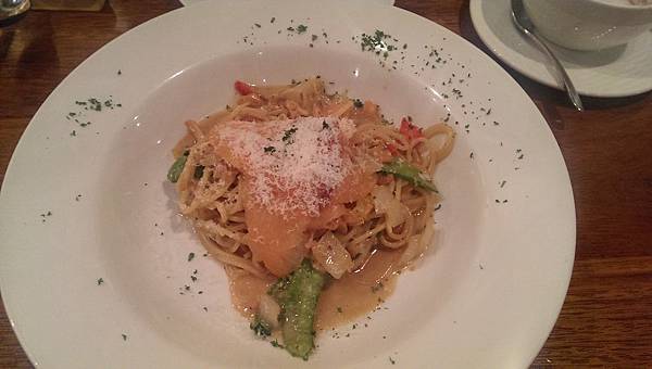 這邊就容我比較偏頗的推薦,因為自己很喜歡吃鮭魚,因此在推薦的主食部份,也是跟鮭魚有關的起司義大利麵,不過這邊要提的是,原先我很擔心起司和義大利麵醬汁,兩種濃郁的味道搭配時,吃起來會有很膩的感覺,不過出人意料的是,起司雖然味道濃,但味道卻很很清爽,混在醬汁裡很恰如其分的扮演提味的角色。建議喜歡吃義大利麵的夥伴們,一定要點這道主食。