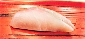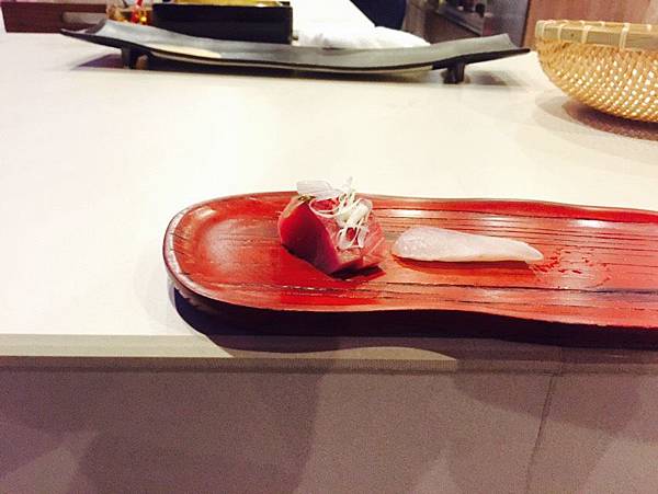 以往在其他日本料理餐廳用餐的經驗,個人對鯛魚刺身的印象,就是味道偏淡,油脂味也比較少的生魚片種類,偶而碰到比較地雷的餐廳,還會吃到有點食之無味的鯛魚刺身,因此老實說,我對這個種類的生魚片基本上沒抱什麼期待。不過老闆第二道端上來的金目鯛,真的是遠遠超過我的期望值,口感適中,不是軟到入口即化的那種,但咬下去還是有鮮嫩的口感,油脂香也適中,不是像鮭魚濃郁油脂香的那種,但剛剛好的香味帶出魚的香味。