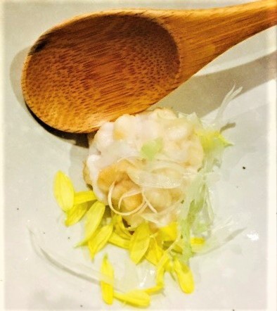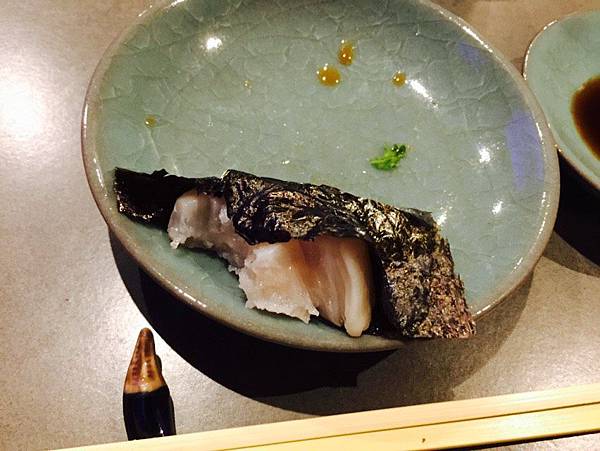 這應該是我在此次用餐中,唯一一道有一點點不喜歡的料理,不過我要先在這邊說明,這純屬我個人喜好問題,基本上食材本身還是很讚,我只是不喜歡這個搭配。新鮮的干貝略為烤過,搭配香味足夠的海苔,我猜想老闆是希望透過海苔脆脆的口感,跟軟嫩帶點嚼勁的干貝搭配,帶出具衝突感的美味。