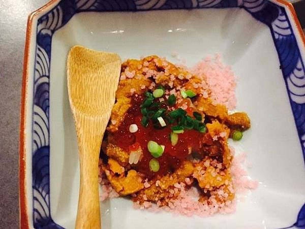 海膽,蝦鬆,壽司飯,鮭魚卵,這四樣食材,個別單吃,都是我很喜歡的東西,不過併在一道菜,搭配成餐點,真的是從來沒有想過的事情 (至少我沒吃過)。咬下第一口就讓人驚艷,先來說口感。蝦鬆略偏乾,帶有一點點咬勁,適度中和了海膽和鮭魚卵帶有水分且軟嫩的感覺,再配著一些軟硬程度剛好的壽司飯,搭著吃真是有說出的美味。在味道方面,鮭魚卵和海膽都屬偏濃郁的食材,蝦鬆和壽司飯則屬於配角類的食物,有主角,也有配角,在口味上的搭配和調和剛剛好,想必老闆真的花了很多心思試岀這道好吃料理,是道創意和美味都滿分的料理。