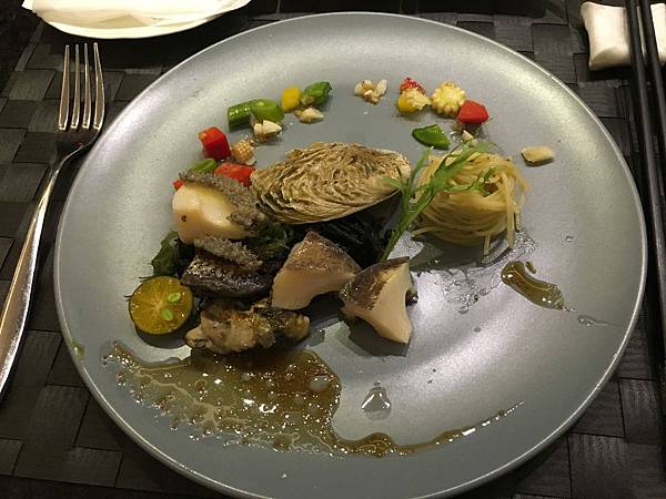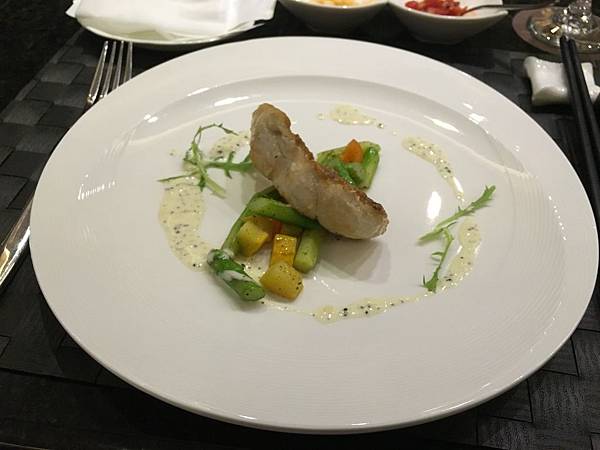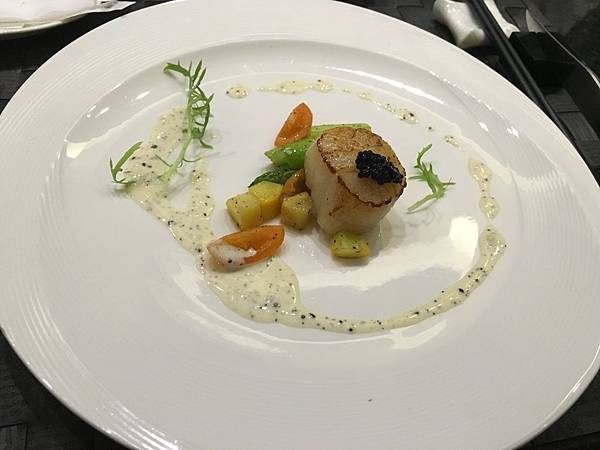 第二副主菜的干貝部分,除了外焦內嫩的新鮮干貝外,搭配的魚子醬更是有畫龍點睛的效果; 干貝的味道雖然在海鮮中是屬於味道較重的,但魚子醬也是屬於鹹味較重的食物,理論上兩個味道比較重的食物相互搭配,很可能在口味上會有衝突的效果,但說不出為什麼,這兩樣美食搭配後,卻意外衝撞出另一種鮮甜的海味,再沾上一點點的松露醬料,無論是味覺或嗅覺都得到極大的滿足。