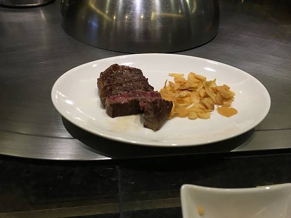 牛排的部份從肉質判斷,犇鐵板燒微風信義應該是選擇prime等級的牛肉食材來料裡外。另外,煎的時間和火侯也剛剛好,除了外皮讓你可以吃到及聞到帶點微焦牛肉的香味外,裡面的部份夠嫩,但並不會讓你覺得太生。唯一要小報怨的是份量有一點點少,兩個人用餐的話一個人只能吃到3塊左右,真的是一點都不過癮。