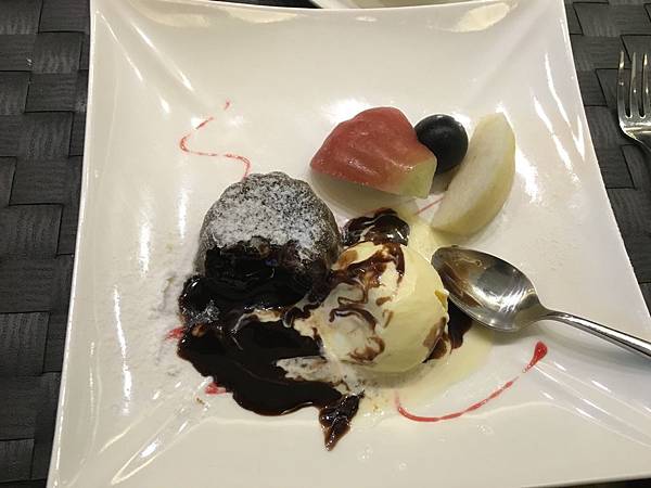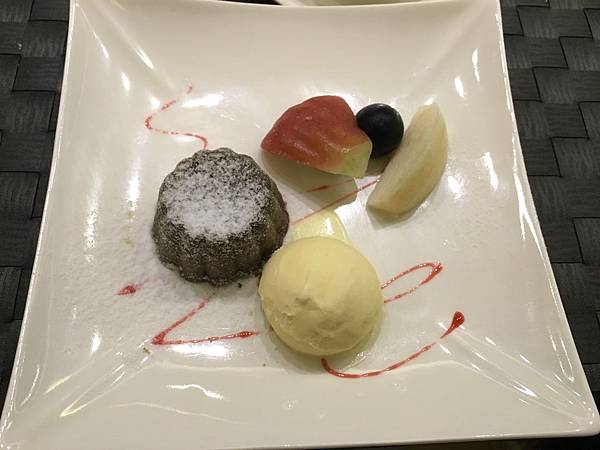 用餐的另一道小高潮出現在另一道甜點。不過這邊先提一下,請大家原諒我的偏見,因為我還真的蠻喜歡吃巧克力的,因此接下來的分享,可能就會充滿了我很多的偏見。這道料理乍看之下,就是巧克力塔配上香草冰淇淋,再加上一點點的水果,好像沒有什麼特別的.......