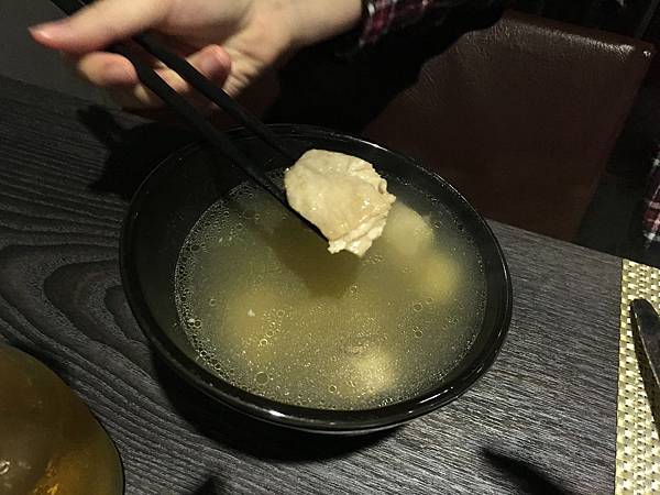 湯品部份,我們在套餐之外,也另外加點了一碗藥膳雞肉湯。原本擔心"藥膳"會不會讓不喜歡中藥味道的女王對這碗湯敬而遠之,不過松築創作和食料理同樣的秉持"一道菜只有一個主軸,其他配料絕不搶戲"的原則,湯頭的部份是濃郁順口的雞高湯,但猜測應該有過濾掉部份的雞油,讓整碗湯喝起來完全不會有油膩感; 藥膳的部份則是純粹扮演配角的角色,微微的藥膳味讓湯頭喝起來更為溫醇,卻又不會有過多的中藥味,藥膳味和雞高湯恰到好處的比例,女王跟我不到5分鐘就把整碗湯喝完了,的確是道值得另外加點的美味湯品。