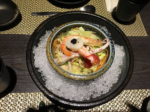 套餐的第一道沙拉就讓人胃口大開,口味部份完全沒有某些沙拉過酸或過甜的醬料干擾,微酸的沙拉醬很稱職的扮演提味的角色; 簡單的生菜佐新鮮干貝以及章魚腳,生菜的脆配上略有咬勁的海鮮,創造上不同層次的口感; 最上頭再搭上香味以及鹹味都很有質感的魚子醬,光是第一道餐點就令人十分讚賞。