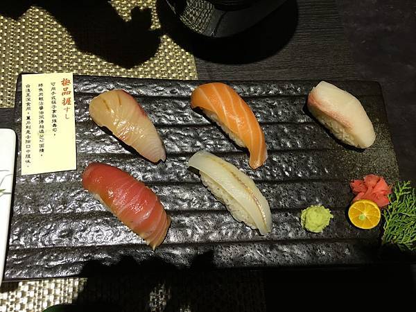 套餐主菜的第一道是握壽司,餐廳很貼心的在盤子的左上方,放上了建議的食用方式,包含應該從淺色魚肉吃到深色魚肉,以及薑片的用途,讓客人可以用更適合的方式享受這道料理。而在食材的部份更是沒話說,雖然松築創作和食料理不是位在漁港旁,但生魚片的新鮮程度,卻完全不輸在漁港吃到的。咬下一口後,真的有置身在海港邊大啖剛上岸的生魚握壽司的幸福感覺。