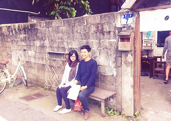 女王坐在Giocare Café圍牆前板凳的照片,是不是很有文青美女的感覺? (重點是"美女"兩個字喔)