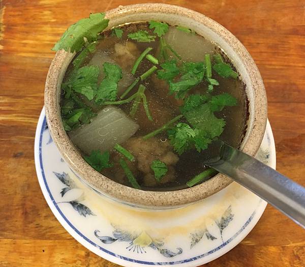 這天用餐的壓軸當然就是如標題所提個人覺得是這家店的明星的香菇肉羹麵:擁有新鮮且極富彈性口感的肉羹,加上同樣吃起來有點Q彈的麵線,一起浸泡在用大骨以及柴魚片熬煮的清爽甘甜湯頭,當一口咬下麵條和肉羹後,伴隨著噴出的高湯馬上就充滿了口腔,味蕾也立即得到了極大的滿足。如果有到這家店用餐的話,真的不能錯過這道超級推薦的香菇肉羹麵。
