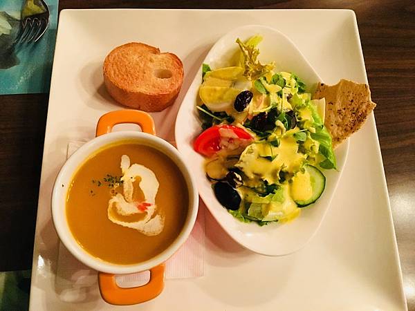 主餐所附的濃郁南瓜濃湯湯品同樣也讓人回味無窮,綿密的口感加上不會過於濃膩的調味,讓濃湯也可以喝起來很清爽。
