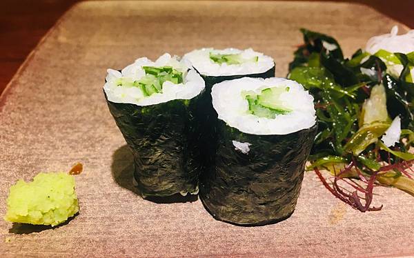 在用餐的尾聲,主廚為了怕女王跟我沒吃飽 (可能是因為他每道餐點上來因為太好吃了,我們幾乎都不超過3分鐘就一掃而空),還貼心的附上美味的海苔壽司,算是整個用餐過程的完美結尾。
