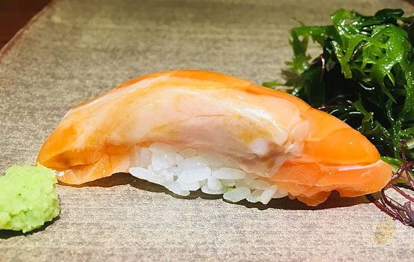 野生鮭魚握壽司則是道看來平凡,但吃起來一點也不簡單的餐點: 相較於一般我們常吃道的養殖鮭魚來說,野生鮭魚少了一些油脂味,但卻多了讓人回味無窮的淡雅風味,可說是道會讓人越吃越好吃的餐點。