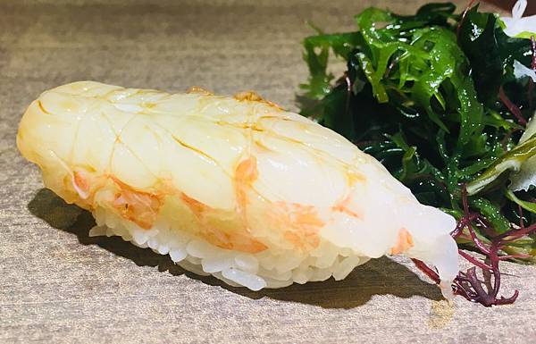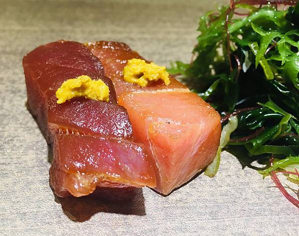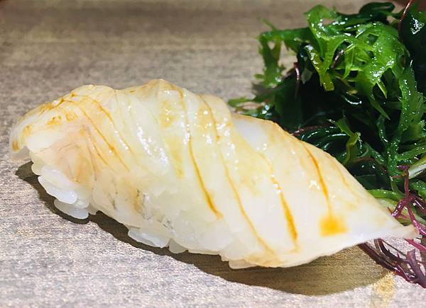 鮪魚握壽司應該是女王跟我用餐的當天,我最喜歡的一道餐點: 原本就很夠味的鮪魚,加上主廚用一點點的特製醬料提味,讓鮪魚的美味又提升了好幾個等級。相信我,這絕對是道吃完會讓你念念不忘的美食。