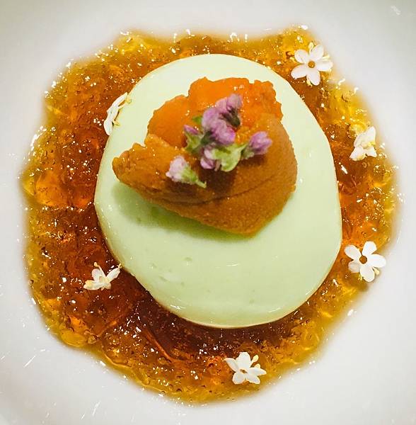 首先上菜的前菜,就非常受女王跟我的好評: 帶有新鮮海味的海膽,搭配略帶酸甜口味的醬汁及類似奶酪口感的食材 (但具體是什麼食材則不太確定) 一起吃,巧妙的讓海膽微微的海鮮腥味完全被中和掉,反而綜合成另一種淡雅且清爽的口味。而這樣的口味組合也讓本來完全不吃海膽的女王完全可以接受,短短不到一分鐘就把前菜一掃而空。
