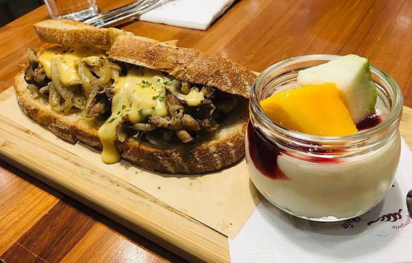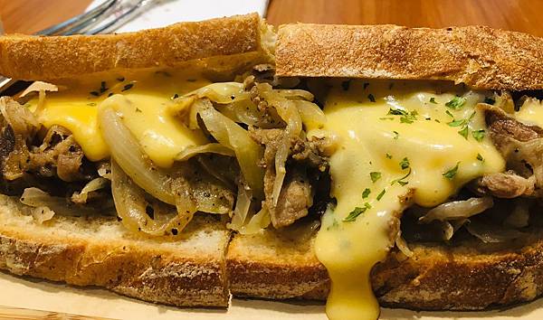 這天女王跟我在擴邦麵包早午餐點的第一份主餐是費城牛肉三明治: 烤得微焦酥脆的土司麵包,配上鮮嫩多汁的牛肉,光是用看的就讓人流口水,再加上微鹹卻又不至於過膩的醬汁,恰如其分的扮演為口味添增層次的角色,如果你是愛吃牛肉的朋友,千萬不能錯過這道餐點。