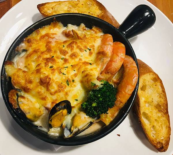 這天的第二份主餐則是白醬海鮮焗麵: 用料澎湃到快要滿出來的各式海鮮,加入濃郁滑順的焗烤,光看就很難覺得不好吃; 加上口感迥異 (偏酥脆) 但跟焗烤卻意外合拍的麵包,是道看起來很衝突但吃起來卻很棒的餐點。
