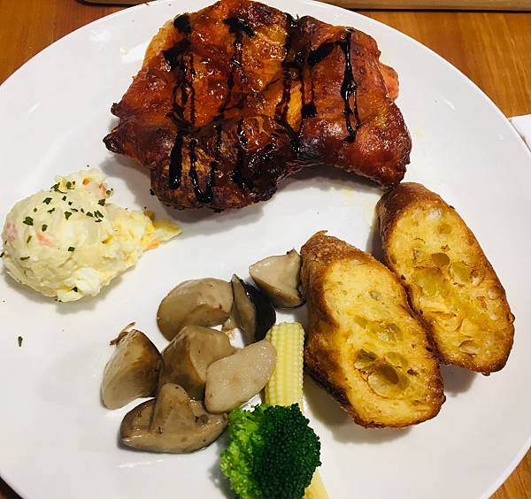 這天在擴邦麵包早午餐餐廳的第三道主餐炭烤歐風雞排,則是得到女王跟我大大大大大大的好評 (也太多大了XD): 烤得恰到好處且香氣四溢的雞排,搭上微甜的醬汁,這種邪惡食物真的很難讓人有機會抗拒,再搭上口味偏清淡的馬鈴薯、蔬菜與杏包菇,是道同時兼顧美味及健康大推早午餐餐點。