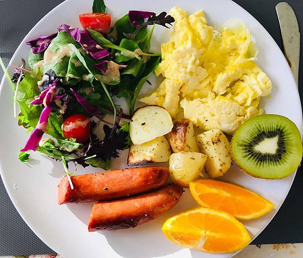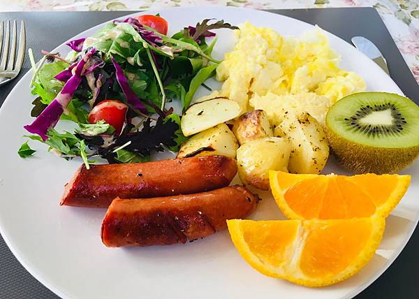 另外一定要大大推薦卡瓦那的早餐: 正如他的空間和建築設計一樣,或許早餐的餐點也看不到什麼非常厲害的食材,但這些新鮮的水果、生菜、雞蛋、馬鈴薯加上香腸,經由民宿老闆簡單的烹煮調味後,反而更能吃出最純粹的食物美味,再加上民宿老闆現沖香濃咖啡的熱情款待,讓女王跟我享用了一頓心暖胃也暖的美味早餐。