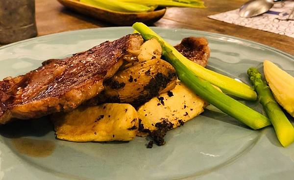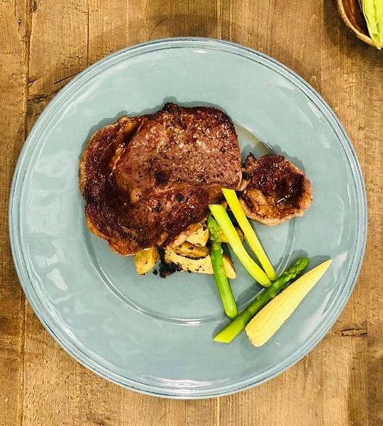 這天女王跟我點的第一道主餐是我們本來完全不期待的肋眼牛排。「親子餐廳的牛排會好吃嗎」? 這是女王點這道餐點後我心中浮起的超大疑問,想不到在一口咬下後便完全改觀: 煎(烤)得微焦的牛肉表面,除了帶有誘人的焦香味外,也完美的鎖住內層的牛肉肉汁,讓每口咬下後都吃得到超美味鮮嫩多汁,再加上餐廳應該是刻意把牛排調整成恰到好處的厚薄程度,讓這塊牛肉既能保有口感,卻又不至於太厚讓小朋友難以入口,大大推薦~