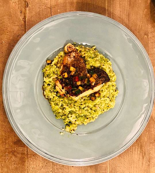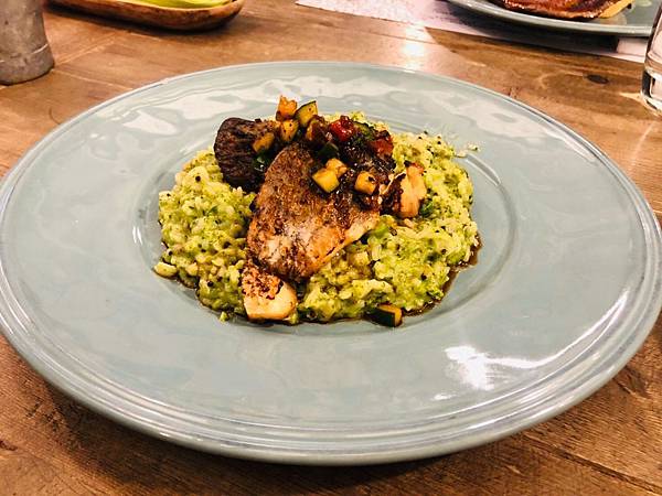 第二道主餐的安心鱸魚佐青醬燉飯,則同樣深得女王跟我的心:煎的剛剛好的鱸魚,除了完整保留鱸魚特有的軟嫩鮮甜外,也透過適當的烹調讓鱸魚的香氣完美呈現; 再加上軟硬適中的不敗青醬燉飯,在吸飽海鮮高湯後更是美味升級。相信我,就算你家小寶貝跟小雞腿一樣只是2-3歲的男生,要吃下超過一半的這道美味餐點也絕對不是問題!