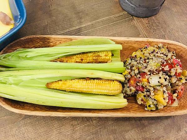 單點的藜麥烤玉米筍則又是另一大小朋友都超愛的料理: 微酸甜醬汁淋在藜麥和搭配水果上,吃起來美味清爽又健康,大朋友應該超愛; 烤得溫熱且軟硬適中的玉米筍,也應該很少小朋友能夠抵抗這個食物的誘惑,只能說農人餐桌親子餐廳在餐點食材組合的設計上真的超用心,把大小朋友的需求都完整的考慮進去了。