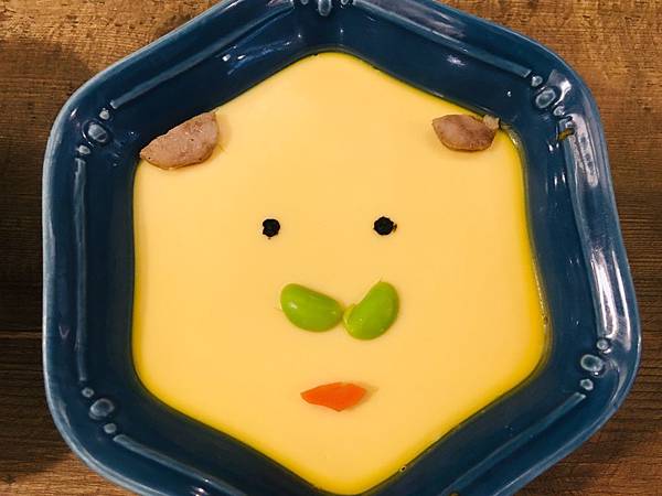 首先上菜的玉米高湯蒸蛋就超級吸睛: 透過不同大小和顏色食材排列而成的小豬造型,可愛的讓人捨不得吃下肚,當然味道也完全不馬虎,一口咬下,清爽純粹的蛋香,搭配玉米帶出的微微鮮甜味,加上滑嫩入口即化的口感,不管大朋友小朋友都一定很愛吃!