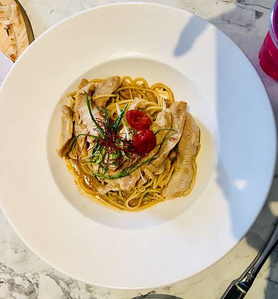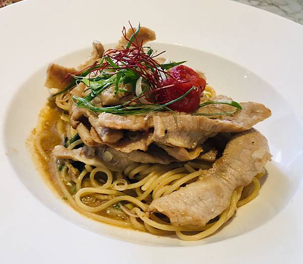 泰式冬蔭功義大利佐松阪豬則也是女王跟我超推的餐點:Q彈多汁的松阪豬肉,本來就是肉類餐點的不敗選擇,再加上泰式微辣的醬汁調味,更100%的把松阪豬肉的鮮甜完整的提味出來,大大推薦~