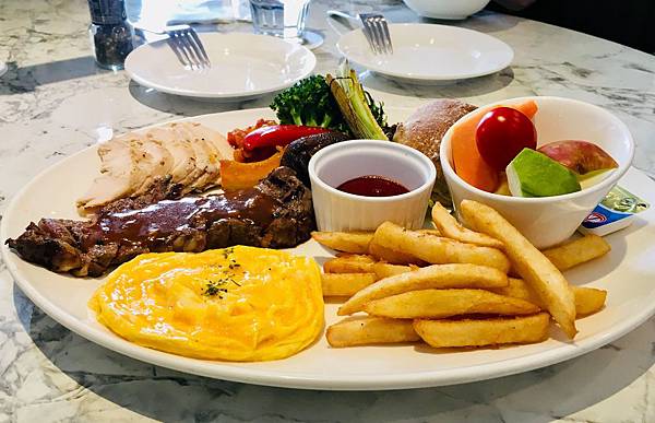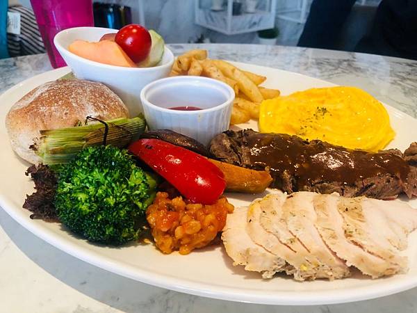 這天上桌的第一道主餐大食量早午餐就超合我的胃口: 健康清爽的雞胸肉,加上鮮嫩多汁的牛肉,兩種風味的肉品組合同時兼顧了飽足感及愛吃肉的味蕾; 加上各式新鮮蔬果及充滿麵香的麵包,讓這道大食量早午餐帶給客人的不只是份量上的滿足,還有滿滿的健康及美味!